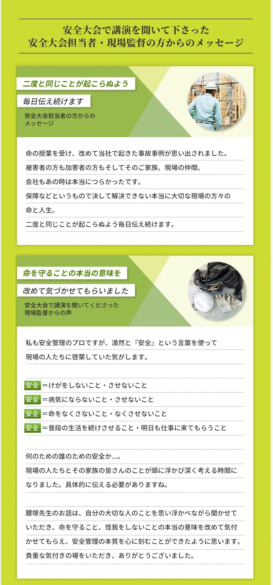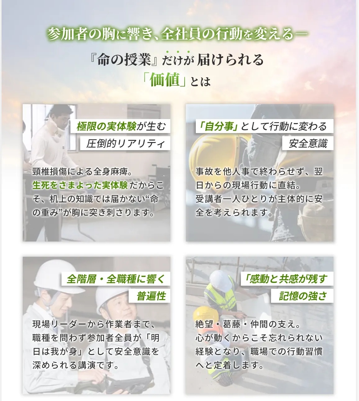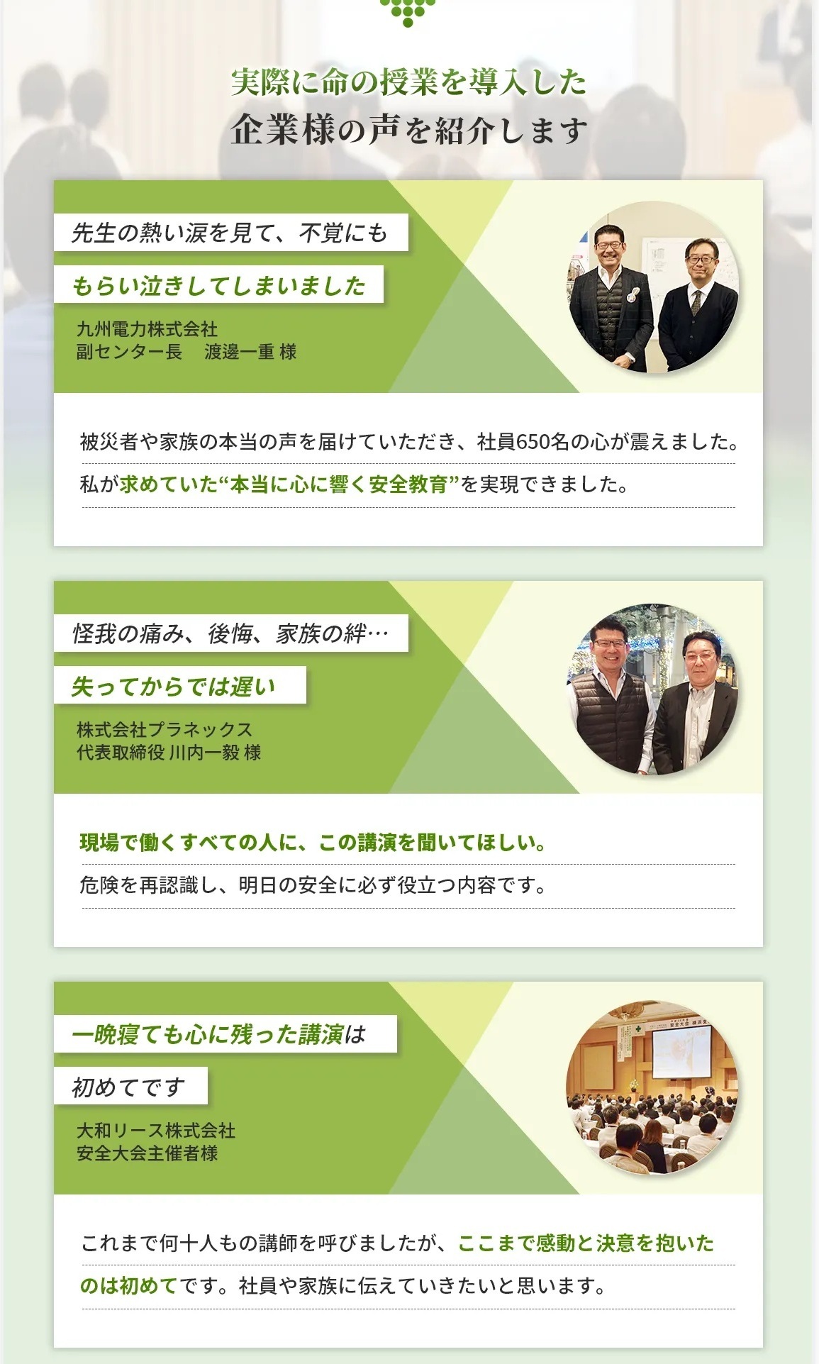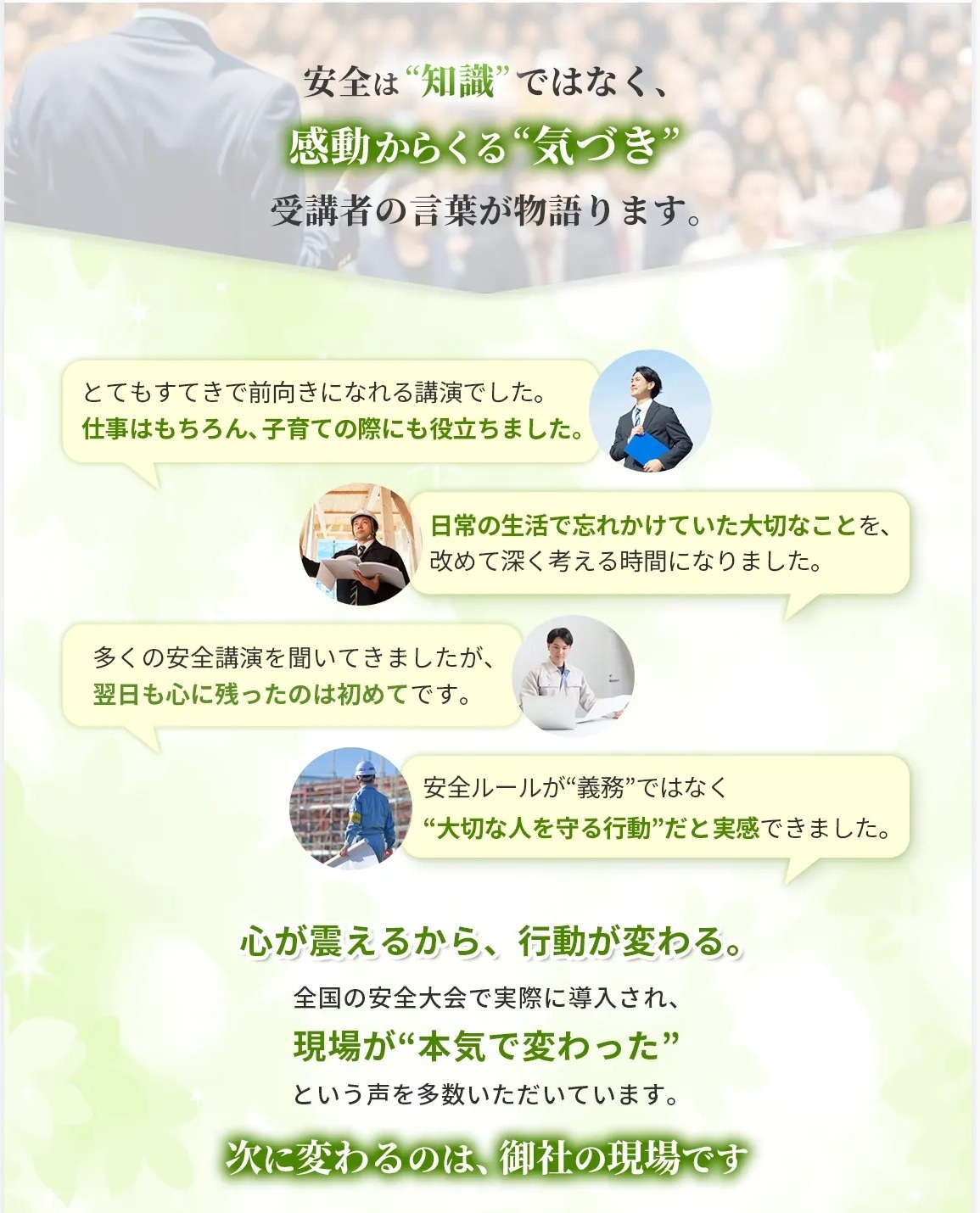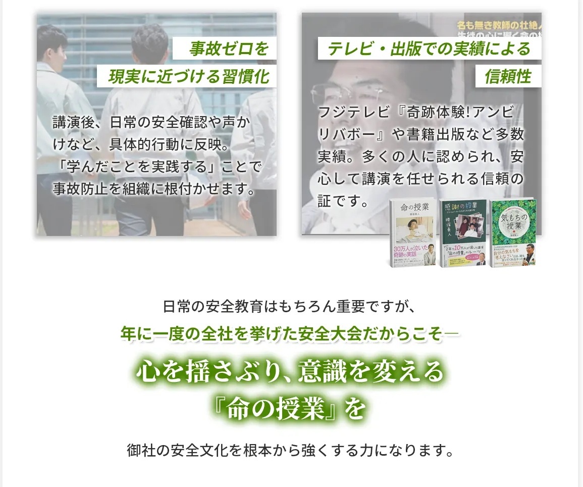 「講演内容は全国の有名な講師が良い」ではなく、「安全大会をより盛りあがるものにするためのベストを尽くせる講師」としてお選びいただけるよう、スタッフも最善のためにベストを尽くさせていただきます。